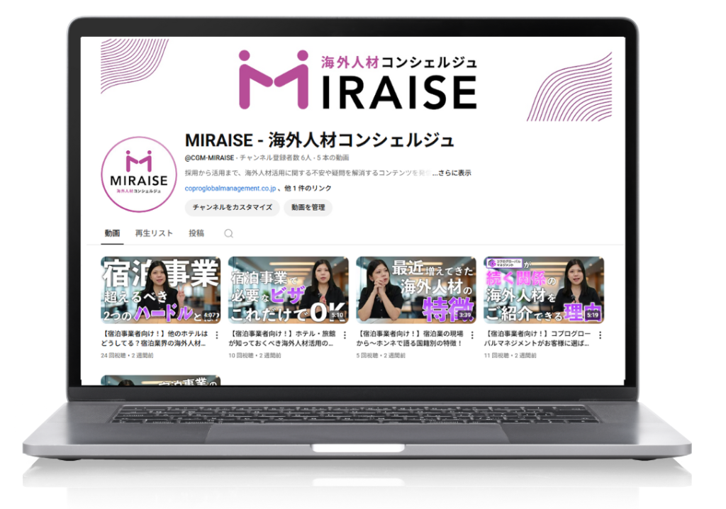 このたびコプログローバルマネジメントでは、海外人材活用に関する動画を発信するYouTubeチャンネル「MIRAISE – 海外人材コンシェルジュ」を開設いたしました。