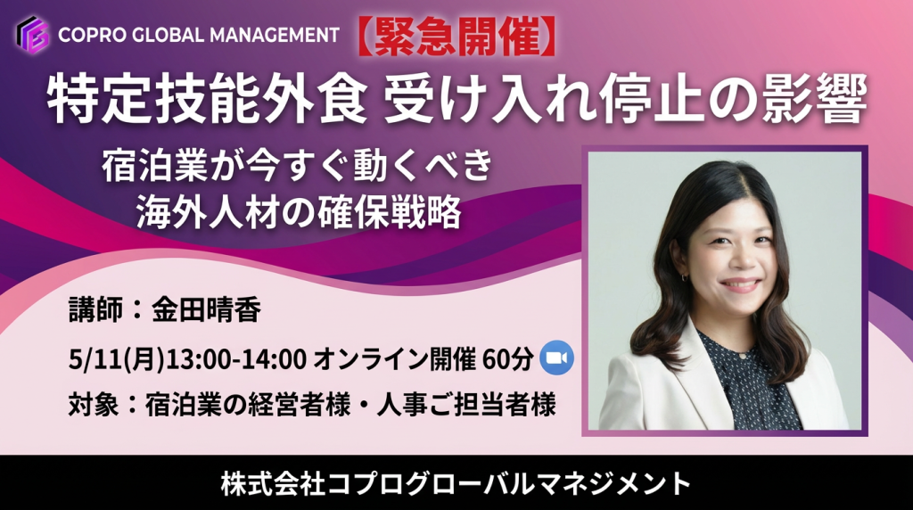 2026.04.21 オンラインセミナー開催のお知らせ | 特定技能外食 受け入れ停止の影響 ~宿泊業が今すぐ動くべき 海外人材確保戦略~【2026/05/11(月)13:00~14:00】